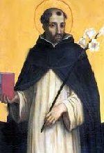 je zakladatel řádu Dominikánů. Narodil se koncem 12.století ve Španělsku. Měl šlechtický původ. Prožil klidné dětsví, studoval filozofii a teologii. Stal se knězem. Žil prostý život v chudobě a se svým přítelem vedl s odpůrci své viry disputace. Když mu přítel zemřel, začala občanská válka. Dominik pokračoval ve své kazatelské práci a založil nový řád.
