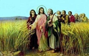 Jednou v sobotu procházel Ježíš obilím. Jeho učedníci začali cestou trhat klasy. Farizeové mu řekli: "Hle, proč dělají, co se v sobotu nesmí?" Odpověděl jim: "Nikdy jste nečetli, co udělal David, když byl v nouzi a měl hlad on i jeho družina? Jak vešel do Božího domu - bylo to za velekněze Abiatara - a jedl posvátné chleby, které smějí jíst jenom kněží, a dal i své družině?" A řekl jim: "Sobota je pro člověka, a ne člověk pro sobotu. Proto je Syn člověka pánem i nad sobotou!"